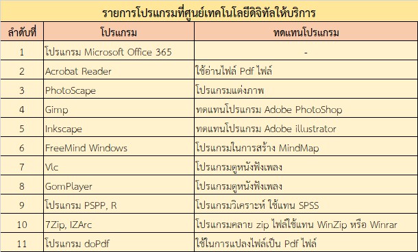 ทั้งนี้ รายการ Software พื้นฐานที่ศูนย์เทคโนโลยีดิจิทัลให้บริการมีดังนี้