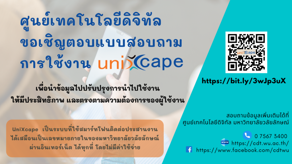 ศูนย์เทคโนโลยีดิจิทัลขอเชิญทุกท่านตอบแบบสอบถามการใช้งาน UniXcape ในการติดต่อประสานงานภายในมหาวิทยาลัย เพื่อนำข้อมูลที่ได้มาประกอบการวิเคราะห์ปรับปรุงการนำไปใช้ให้มีประสิทธิภาพ และตรงตามความต้องการของผู้ใช้งานให้ดียิ่งขึ้น ที่ลิงค์ https://bit.ly/3wJp3uX หรือ QR Code ทั้งนี้ ขอความกรุณาตอบแบบสอบถามภายในวันที่ 15 มิถุนายน 2564