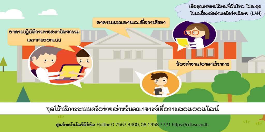 ศูนย์เทคโนโลยีดิจิทัลแจ้งจุดให้บริการระบบเครือข่ายคอมพิวเตอร์สำหรับคณาจารย์เพื่อสนับสนุนการเรียนการสอนออนไลน์ โดยมีจุดให้บริการที่อาคารต่าง ๆ ดังนี้