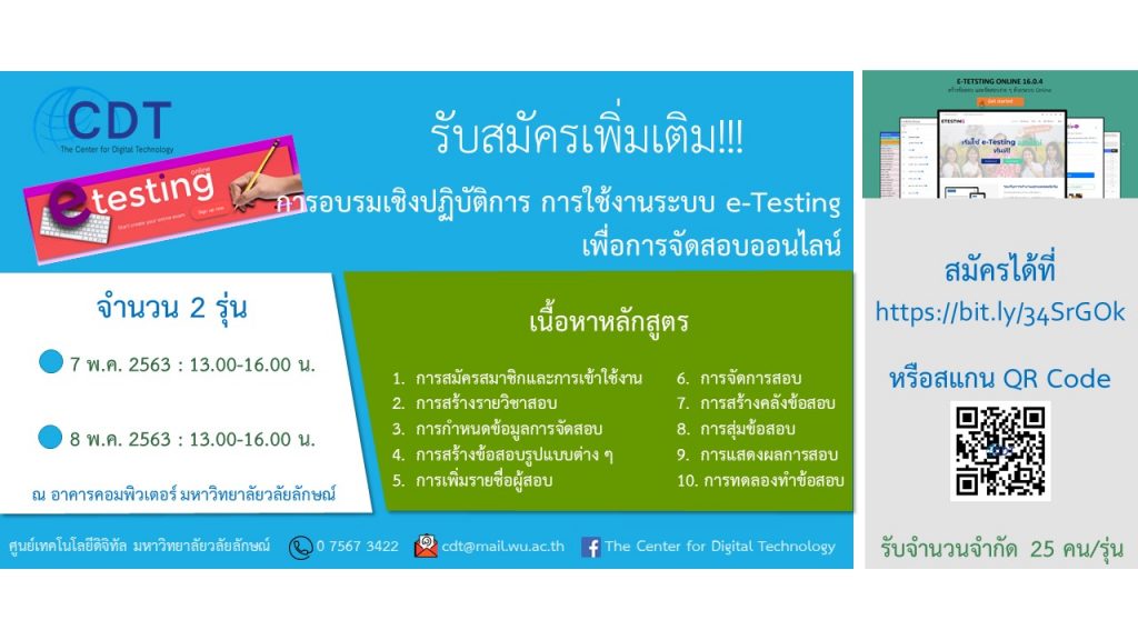 ตามที่ศูนย์เทคโนโลยีดิจิทัลจัดอบรมเชิงปฏิบัติการ การใช้งานระบบ e-Testing เพื่อการจัดสอบออนไลน์ และเปิดรับสมัครอาจารย์และผู้สนใจ จำนวน 5 รุ่น นั้น ปรากฏว่ามีผู้สนใจลงทะเบียนเข้าอบรมจำนวนมาก ในการนี้ จึงเพิ่มรอบการอบรมเชิงปฏิบัติการ การใช้งานระบบ e-Testing เพื่อการจัดสอบออนไลน์ อีก 2 รุ่น ในวันที่ 7-8 พฤษภาคม 2563 เวลา 13.00 – 16.00 น. ณ ห้องปฏิบัติการและฝึกอบรมเทคโนโลยีดิจิทัล 2 อาคารคอมพิวเตอร์ มหาวิทยาลัยวลัยลักษณ์ โดยมีกำหนดการอบรมดังนี้