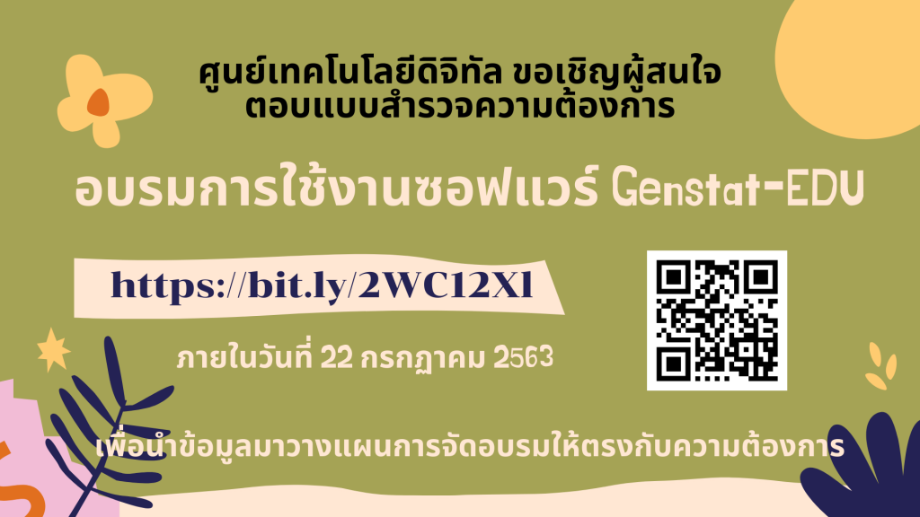 ตามที่มหาวิทยาลัยวลัยลักษณ์ได้รับการสนับสนุนซอฟแวร์ GenStat-EDU เพื่อใช้ในการเรียนการสอนและการวิจัย จากบริษัท Biosci (Thailand) Co.,Ltd นั้น เพื่อให้การใช้งานซอฟแวร์ดังกล่าวมีประสิทธิภาพ และนำไปใช้ประโยชน์ได้ตรงตามความต้องการ ศูนย์เทคโนโลยีดิจิทัลจึงขอสำรวจความต้องการในการเข้าร่วมอบรมหลักสูตรดังกล่าว เพื่อนำมาวางแผนการจัดอบรมได้อย่างเหมาะสม